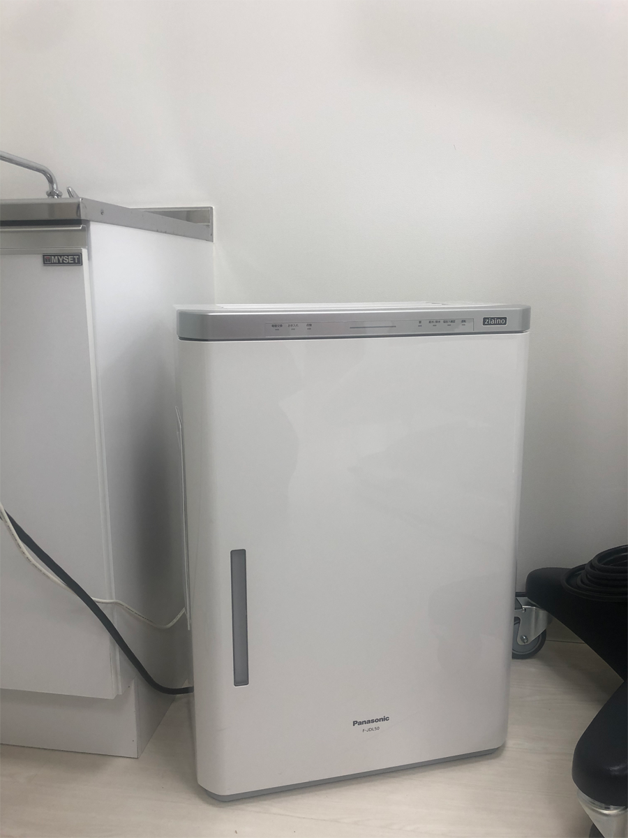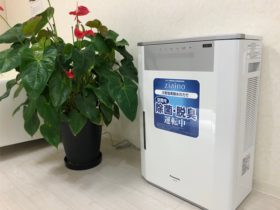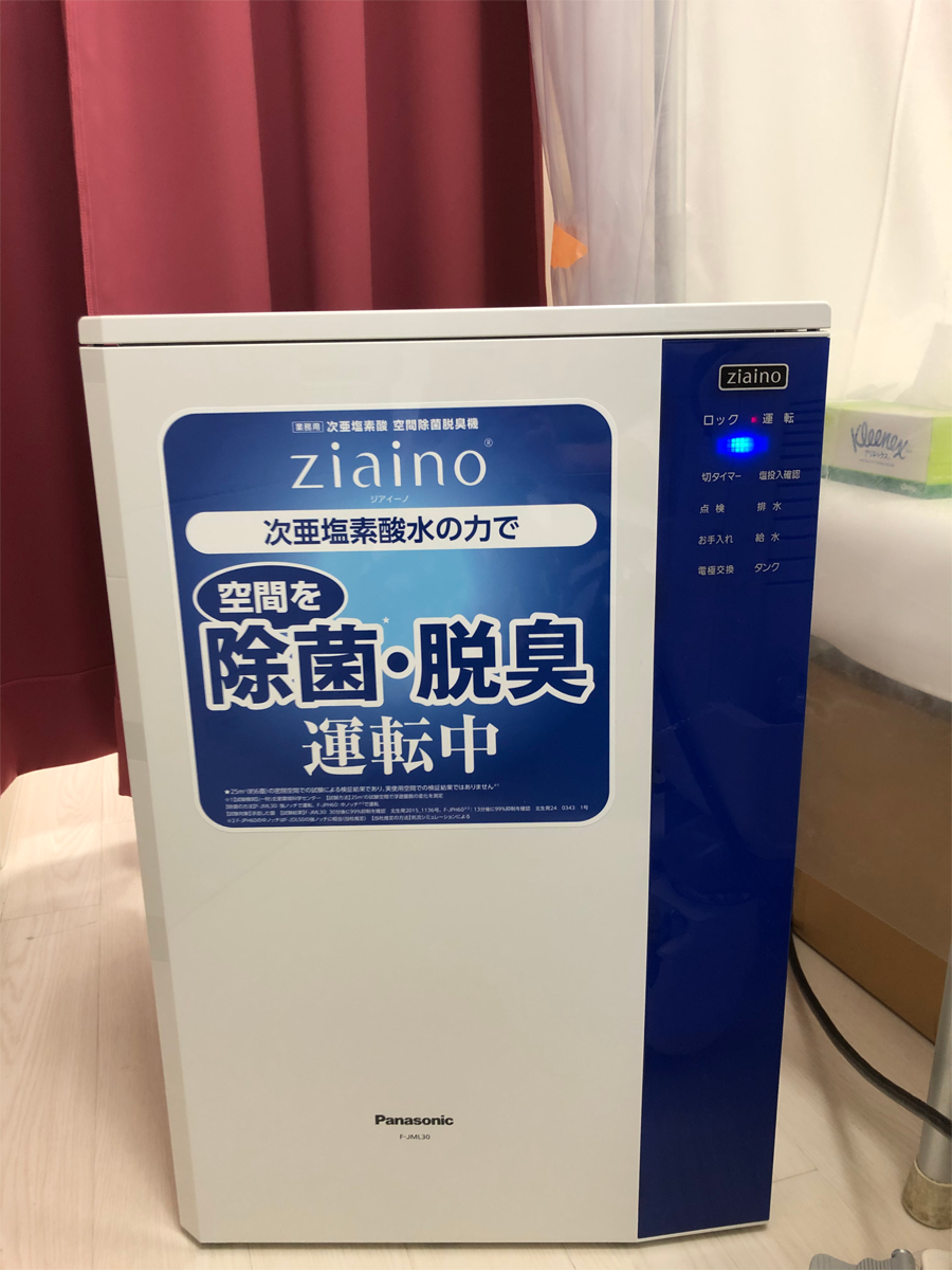 当院では、開院当初より各お部屋に、次亜塩素酸での空気除菌脱臭機を設置し、指定空間サイズの3倍容量で稼働させ感染症予防に努めております。