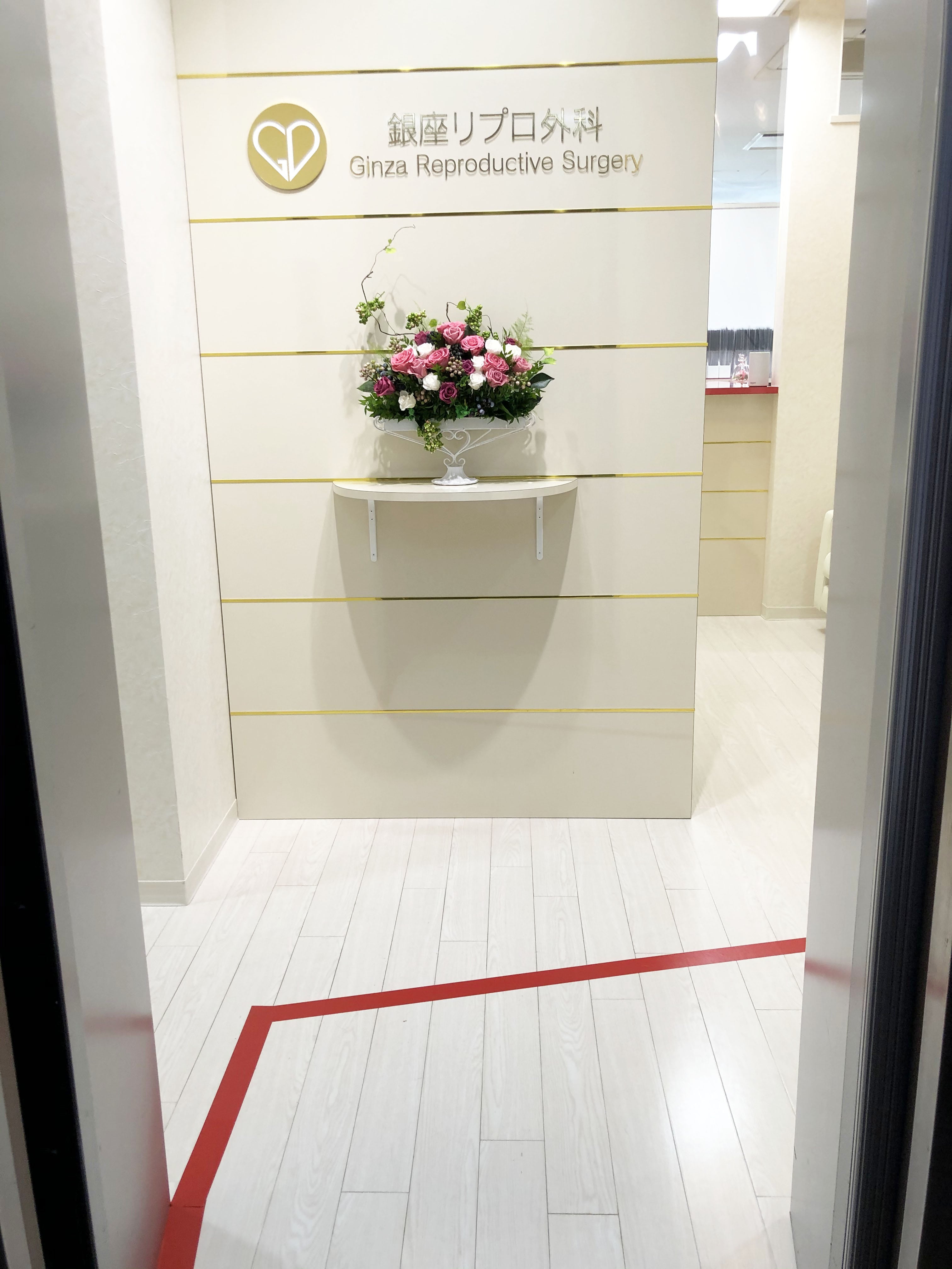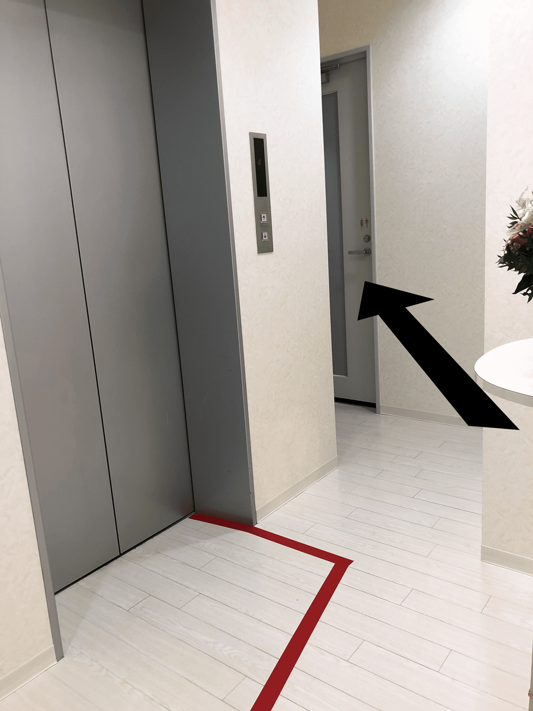 エレベーターを降りましたら、赤い線の手前を右にお進みください。