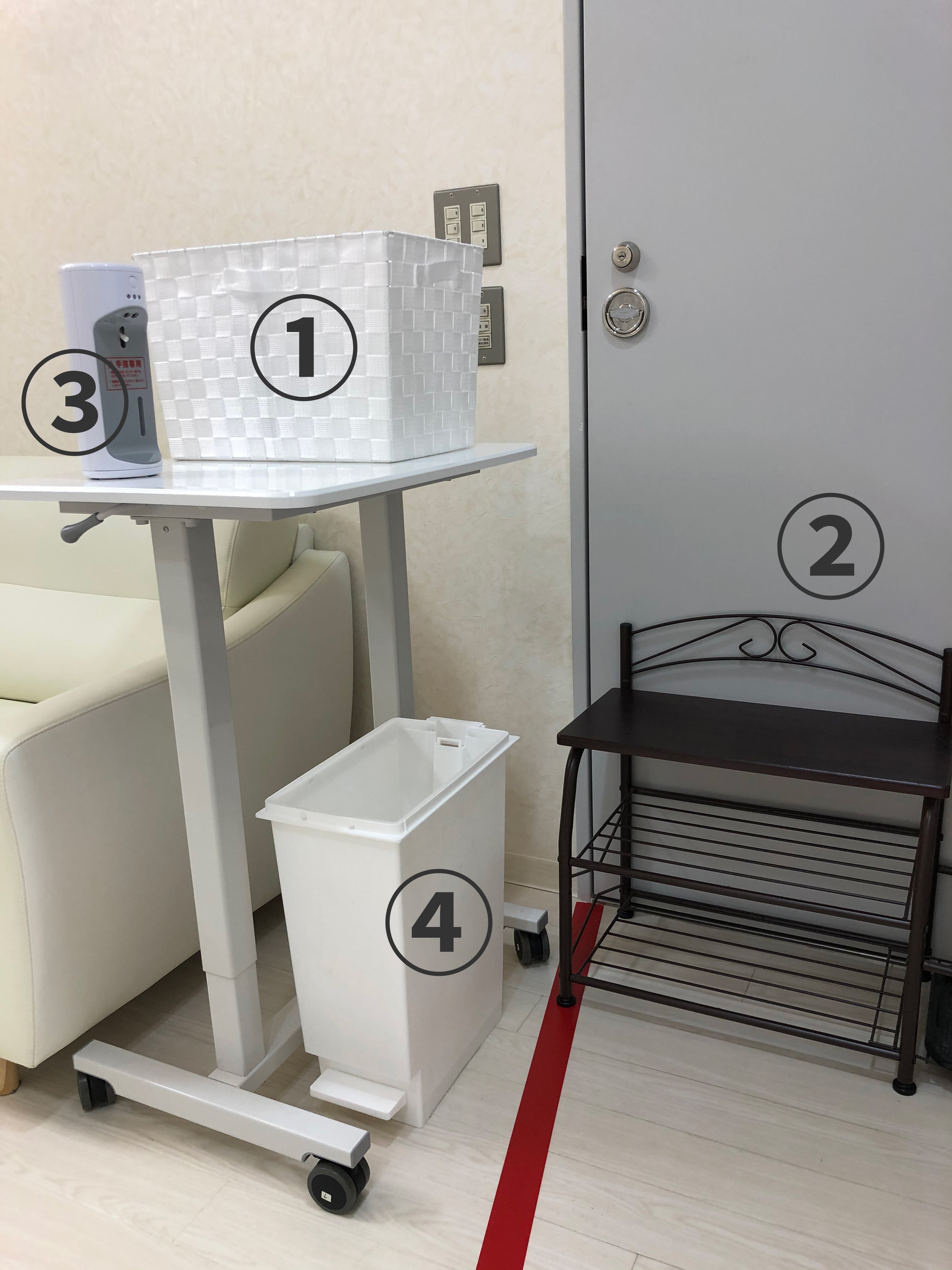 ③台に置いてあるアルコールで手指消毒をしてください。